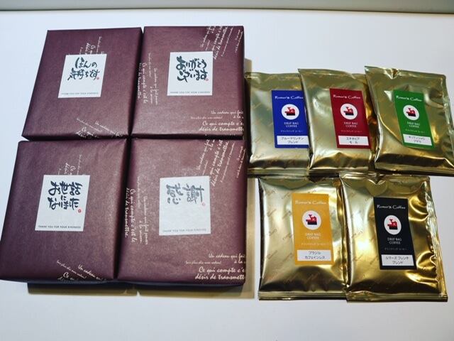 ドリップバッグ5種5個入りで、小箱詰めに致しました。4箱セットです。メッセージシールの変更は可能です。ご注文の際にお知らせください。